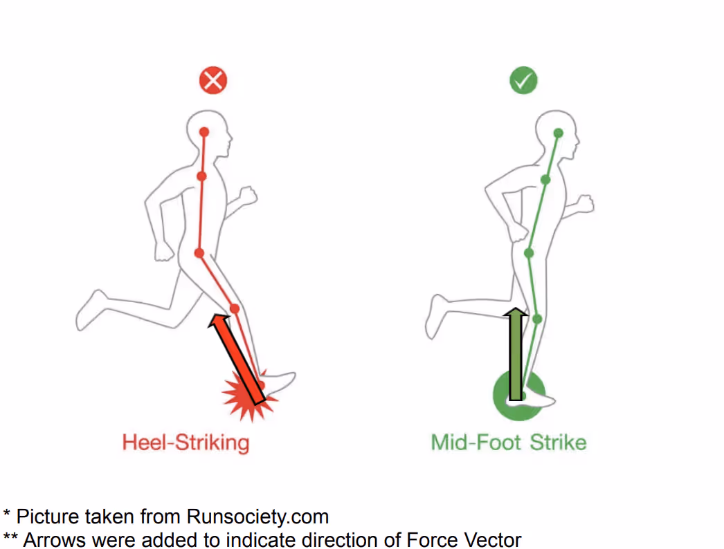 Luckily, there are a few ways to prevent pain and running-related injuries. The first way, and arguably most important, is to practice striking the ground underneath your body rather than out in front. Doing so helps to transfer the force up rather than before when the force was directed backwards, which now creates more of a propulsive force rather than a breaking force (see pictures below for a breakdown). Another reason why this is helpful is it then becomes easier to strike the ground with more of your midfoot vs your heel, allowing you to absorb the forces first by the calf muscles before distributing the forces to the knees and hips. The second way we can reduce the impact is by increasing your running cadence.